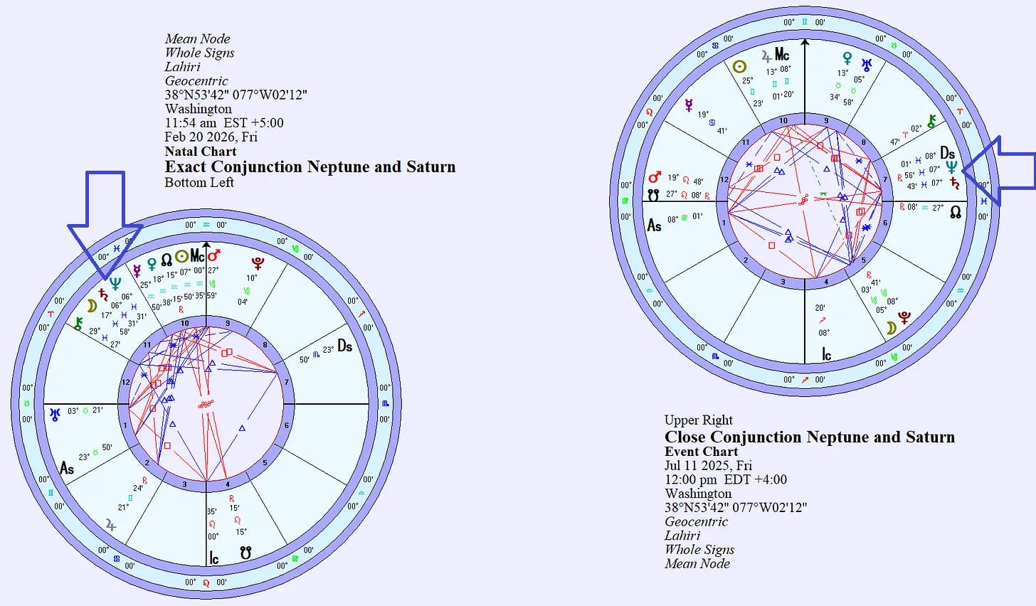 This event has been a long time coming! This is because Saturn and Neptune have been in a prolonged interaction leading up to this exact conjunction. They formed a very close conjunction (within one degree or orb) during June, July, and August of 2025, reaching their tightest approach of just thirteen zodiacal minutes in mid-July. This occurred around the time that they both were stationing retrograde. After separating in September, they began approaching again and re-entered a one-degree orb around February 7, 2026. The exact conjunction is on February 20, after which the two planets gradually move beyond one degree by March 4.